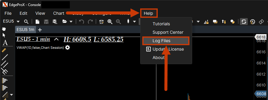 Another way to view log files is after you log into the platform. Once logged into EdgeProX, select the "Help" button in the top menu row. After the dropdown menu appears, select "Log Files".