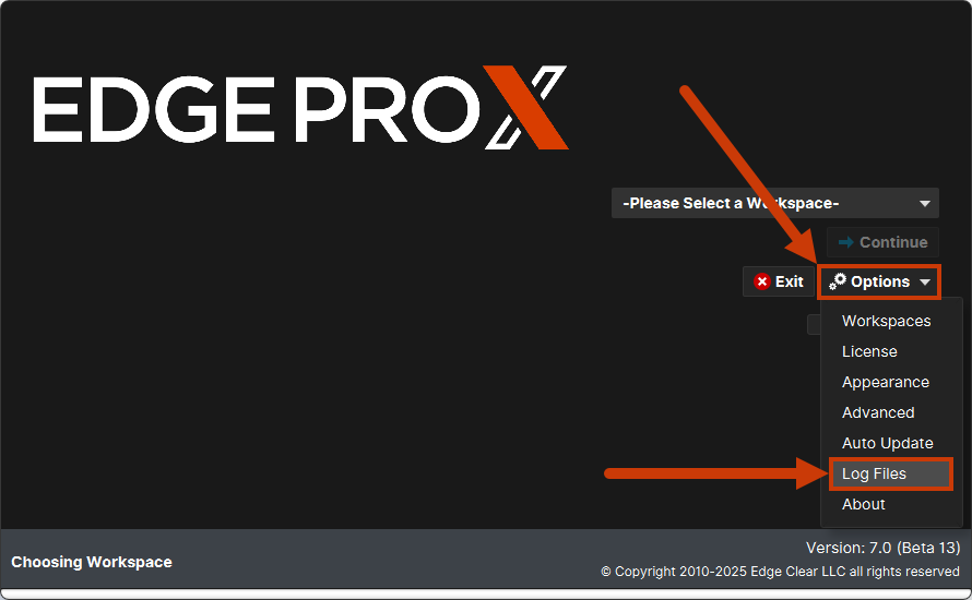 There are multiple ways to access the log files. In order to access log files on the EdgeProX platform, before logging into a workspace, select "Options" and then "Log Files". This will access the computer's hard drive, displaying the log files for EdgeProX.