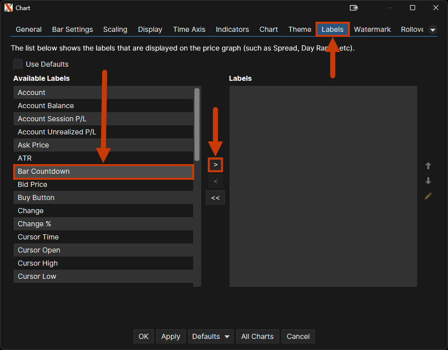 Find "Bar Countdown" on the "Available Labels" column, and press the > sign to add it to the chart. Press "Apply" and "OK".
