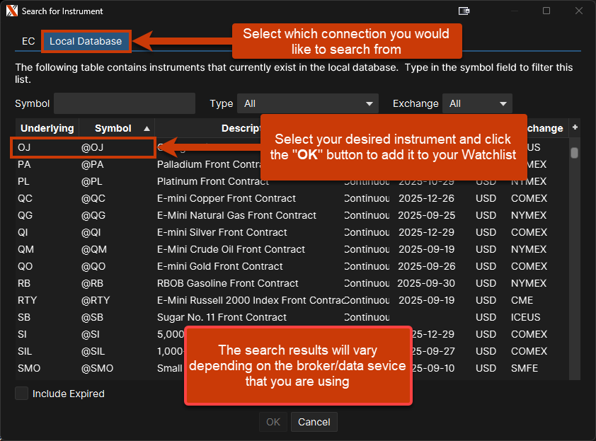 2. The below picture gives a description of the search instruments tab. This is where you can see how to add the different instruments to your watchlist.