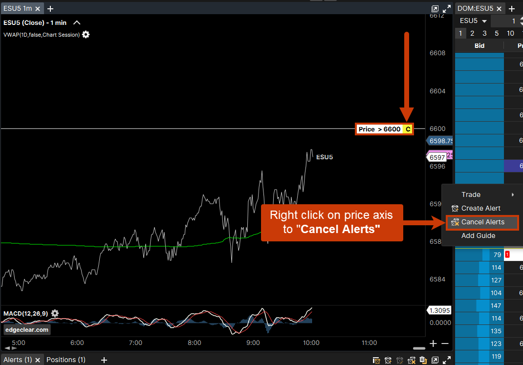To alter an alert from a chart, double click on the alert. To delete an alert, press the yellow "C" next to the alert. Alternatively, right click on the Price Axis and select "Cancel Alerts".