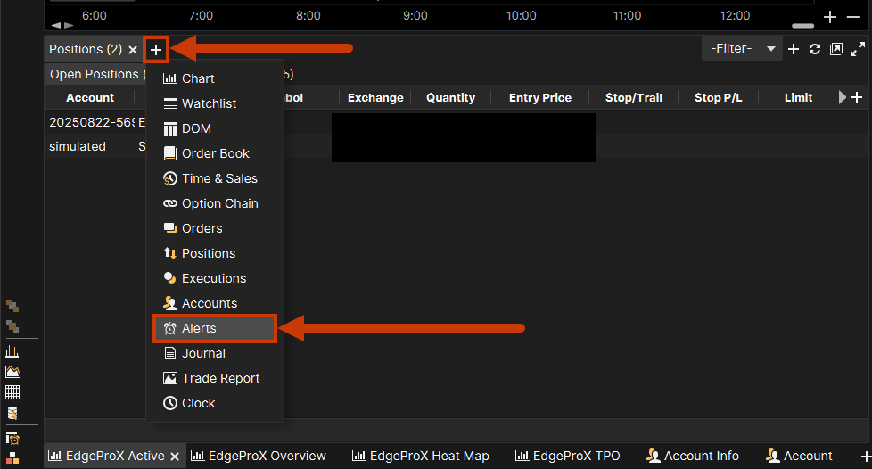 To add the Alert Tab, press the "+", and select "Alerts" from the drop-down menu. From this tab, all alerts can be viewed as well as created, deleted, or edited.