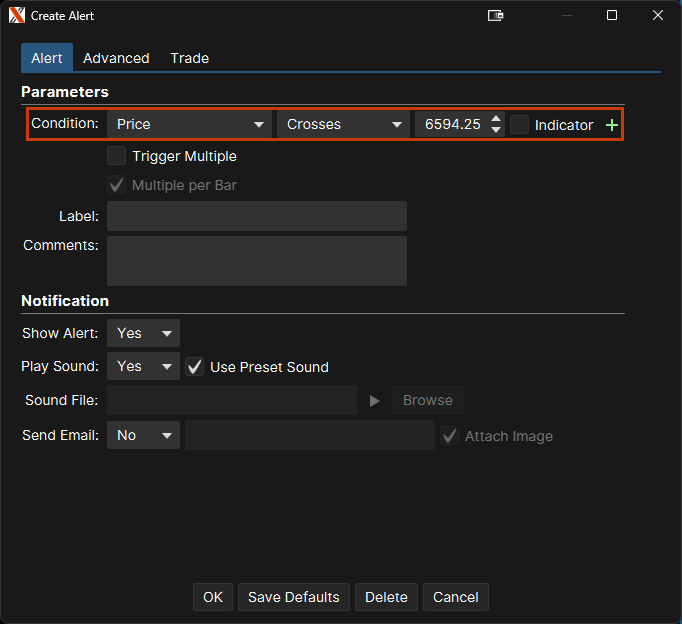 Alerts are used to notify a trader when an instrument trades at a certain price or volume. The alert will play a sound notification and/or send an email and can be configured to close an open active position.