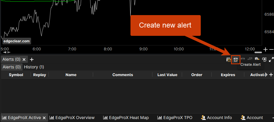 If you have the Alert sub-tab open on the bottom of the chart, press the "Create Alert" on the top right of the tab. If the Alert sub-tab is not visible, please see further in the article for instructions on how to open the sub-tab.
