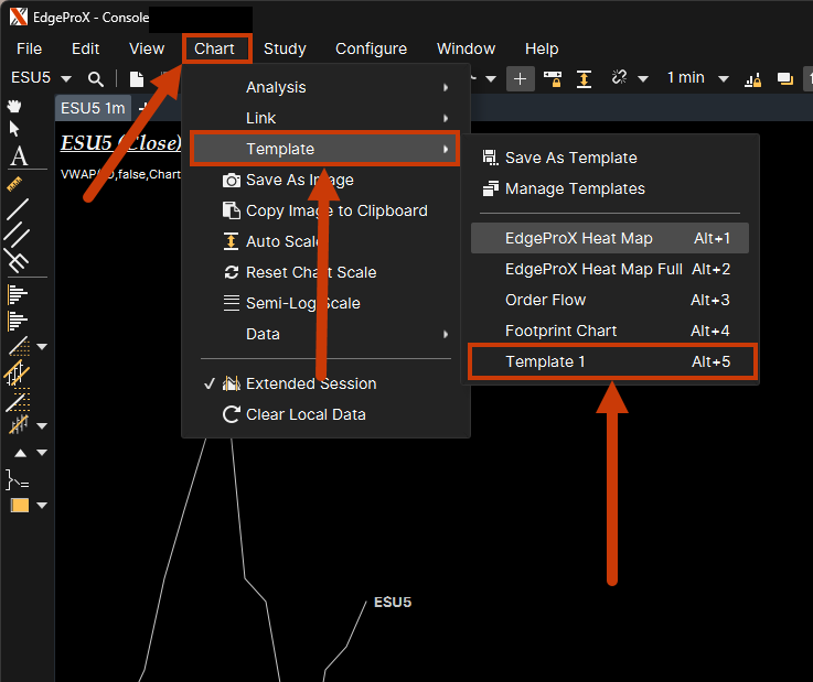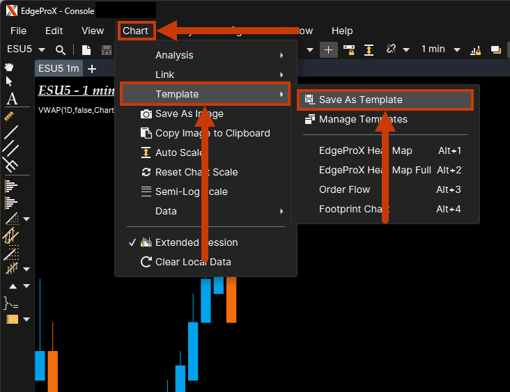 To save a Template, first create a chart with all the studies, bar types, etc, that are to be saved. Once the chart is set up as desired, navigate to Chart > Template > Save As Template.