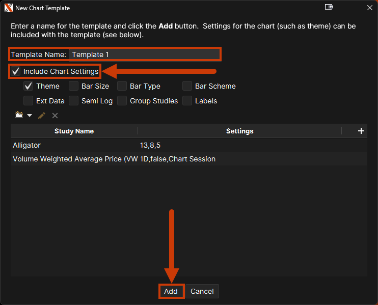 Creating and saving Templates allows a user to quickly apply favorite studies, bars, and more to a new chart.