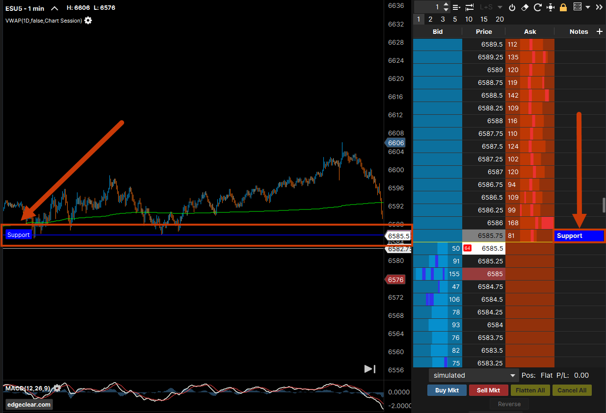 While trading with the DOM on EdgeProX, there may be times where you want to mark specific information about a given price level. For example, if you want to mark a support at a specific price level and you want this information visible on the DOM, you can mark this in the notes section. This guide will walk through enabling and using the Notes feature of the DOM.