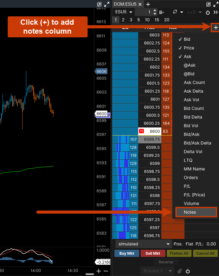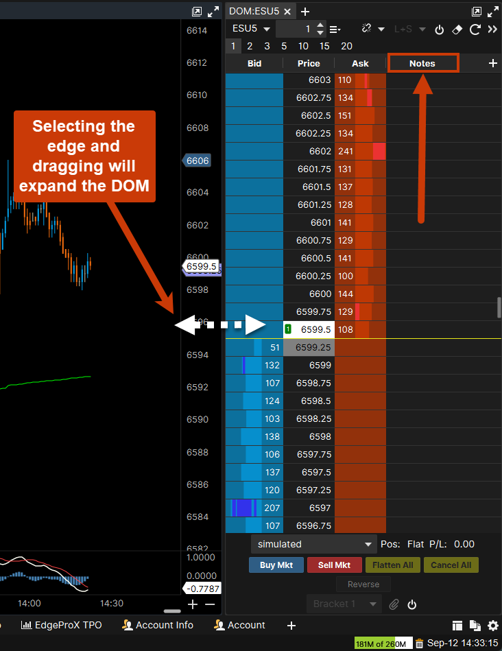 Depending on how your DOM is currently configured, you may have to expand its window to accommodate the Notes section. You can do this by selecting the left edge of the DOM window and dragging. Additionally, you can place the notes section wherever you'd like on the DOM. In this example, it is placed between the Price and Ask columns.