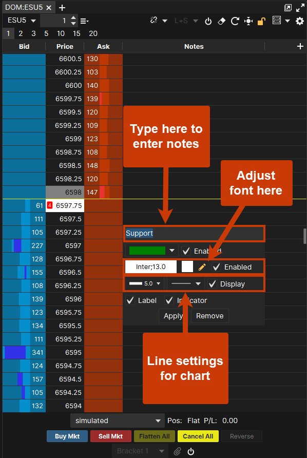 IMPORTANT: Notes made on the DOM will only show on charts if utilizing an attached DOM Window. Floating or independent DOM Window's will not be able to apply the notes to the chart.