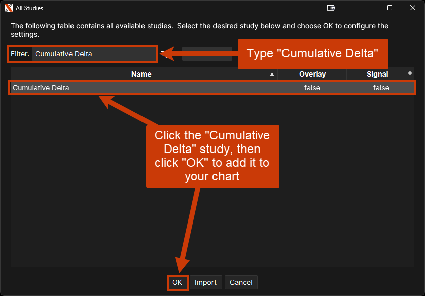 The next step in pulling up the Cumulative Delta study is by typing in "Cumulative Delta" in the search bar then clicking on it when it comes up then pressing "OK". The picture below can provide detail on what this should look like.