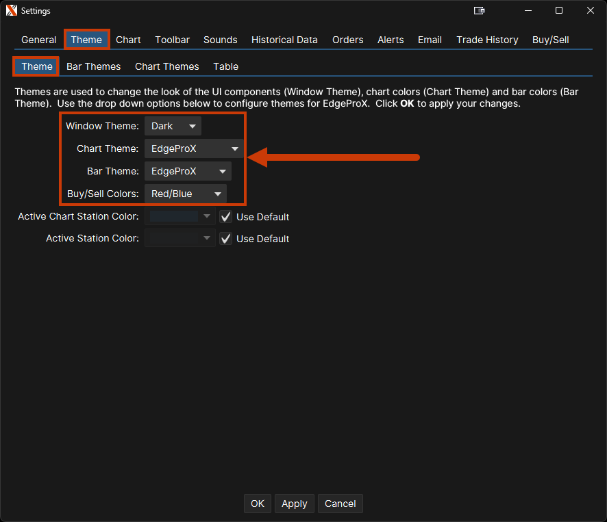 In EdgeProX, themes are used to change the look of the UI components window color (Window Theme), chart colors (Chart Theme), and bar colors (Bar Theme).