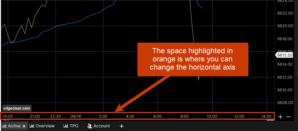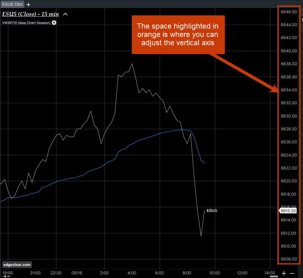 1. The first way to change the sizing on your chart is manually. You will need to change the vertical axis then the horizontal axis. Navigate to the vertical axis of your chart. The space within the price axis will allow you to click and drag up and down to change the sizing of your chart. View image below for clarity: