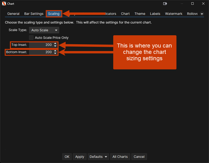 4. Next, go to the "Scaling" tab. This is where you will see "Top Inset" and "Bottom Inset". Changing these will change the spacing from the top to the highest candle shown and It will also change the spacing from the lowest point on the chart to the lowest candle shown.