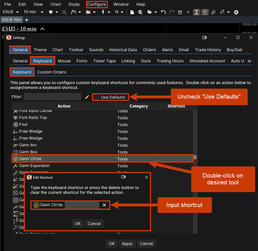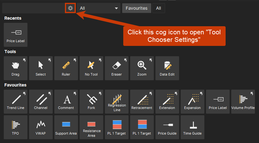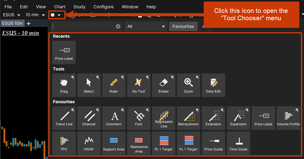 Tool Chooser allows traders to place lines, labels, target areas, and other analyses to their chart. These tools may be referred to as "Drawing Tools" in other platforms.