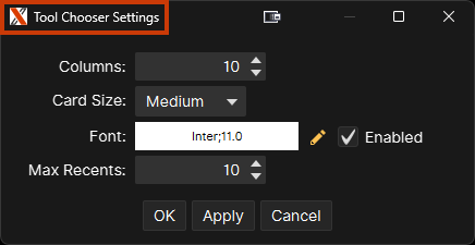 To open Tool Chooser Settings, select the Cog icon to the right of the search bar that opens when you click into Tool Chooser. This will open a smaller window labeled "Tool Chooser Settings". These settings will allow you to edit the amount of columns displayed, card size, font, etc.
