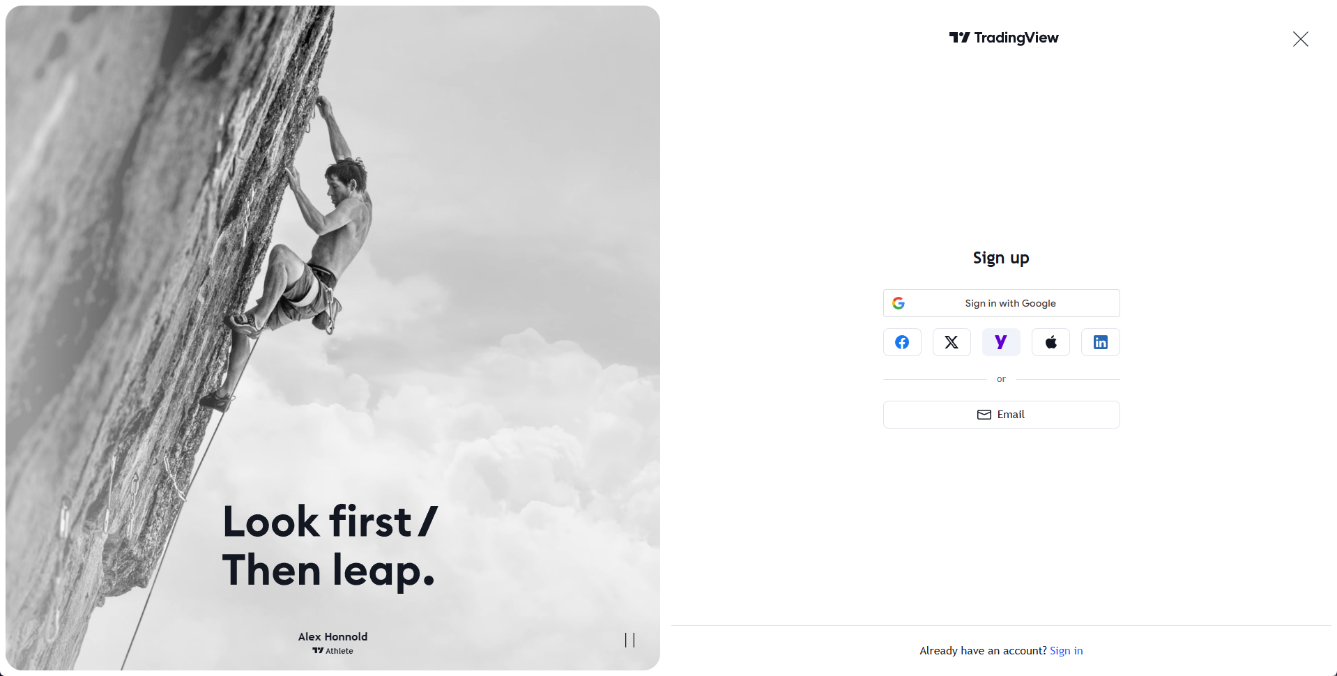 3. You will be presented with a variety of single-sign-on options, as well as the option to create your account with an email of your choice. If you choose the option to create your account using your email, you will be prompted to create a TradingView password. Otherwise, you will be signed in using the credential of your selected SSO service.