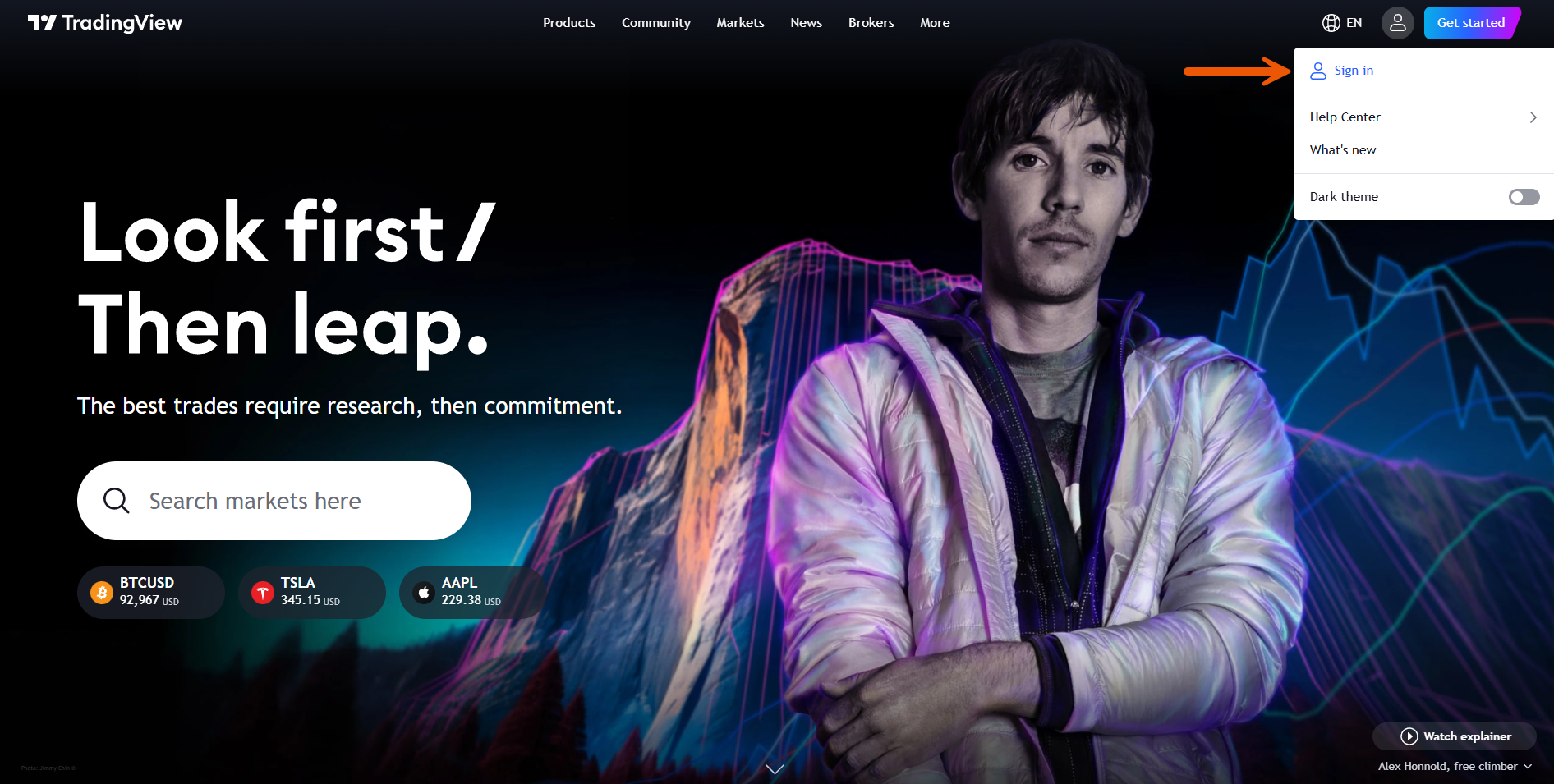 1. Navigate to TradingView's website and select the person-shaped member icon. A dropdown menu will appear. Please select "Sign In" from this menu