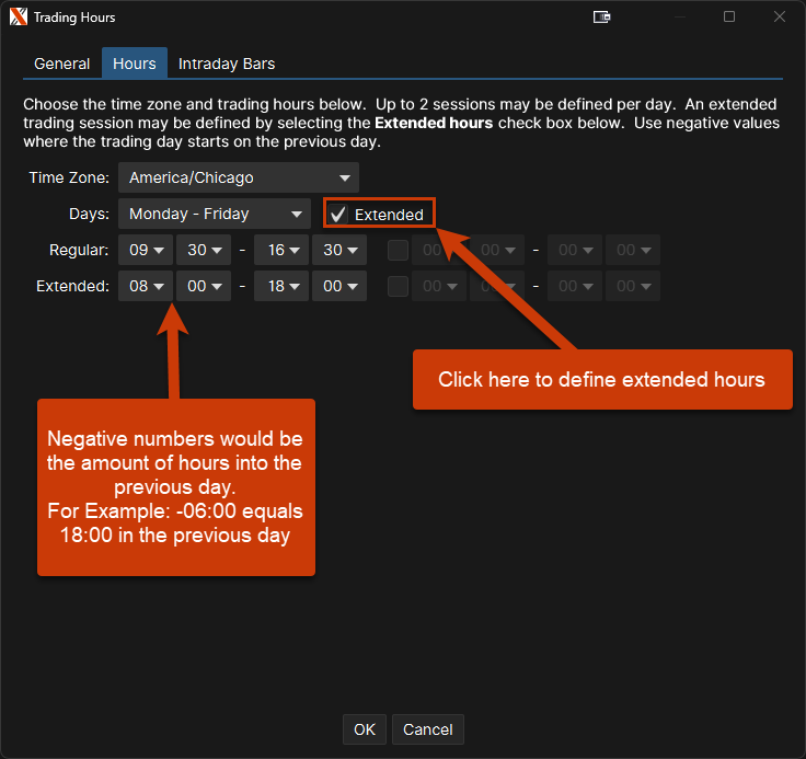 Note: It is not recommended to change the default instrument/exchange hours unless you are seeking a specific window of time to view the market.