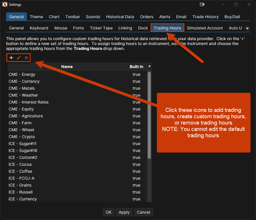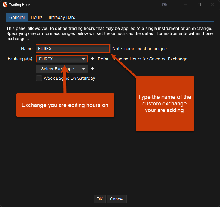 The Trading Hours dialog will appear when you click the Add button (white ‘+’) above. If an exchange is chosen, then the hours defined in this dialog will be used as the default trading hours for instruments on that exchange.