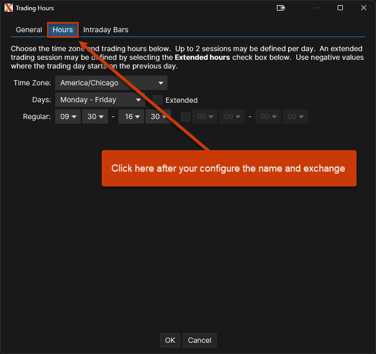 Trading hours define the days and time of day that an instrument is traded. For most instruments, the trading hours should be assigned automatically by EdgeProX.
