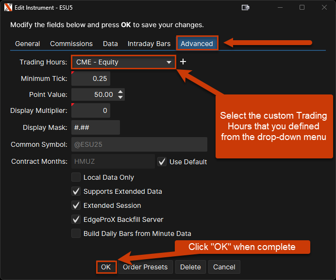 The Trading Hours for an instrument can be assigned from the Advanced tab of the Instruments dialog. This dialog can be accessed from the Context menu of a chart (right click on a chart and choose Edit Instrument). The below picture is what the pop-up menu will look like when you right click. The last step is to click the “OK” button at the bottom of the menu. This will complete the edit instrument step.