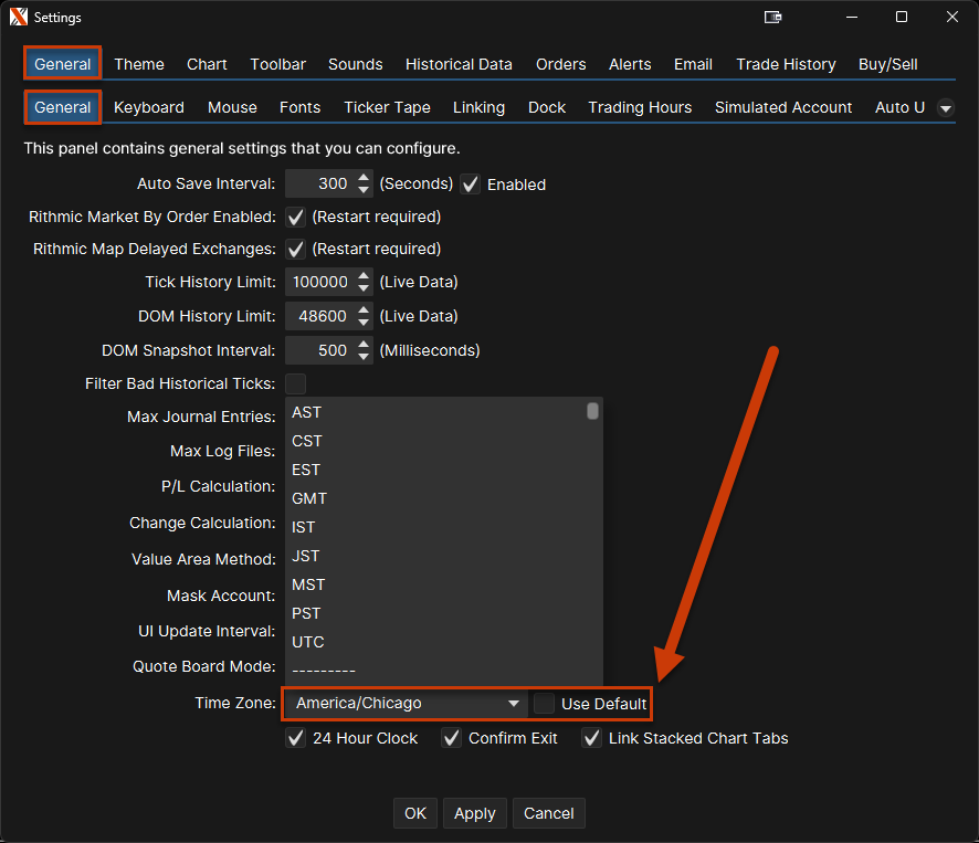 Navigate to the "General" tab and under the "General" subtab, go to "Time Zone" and deselect "Use Default". Then, select your desired Time zone.