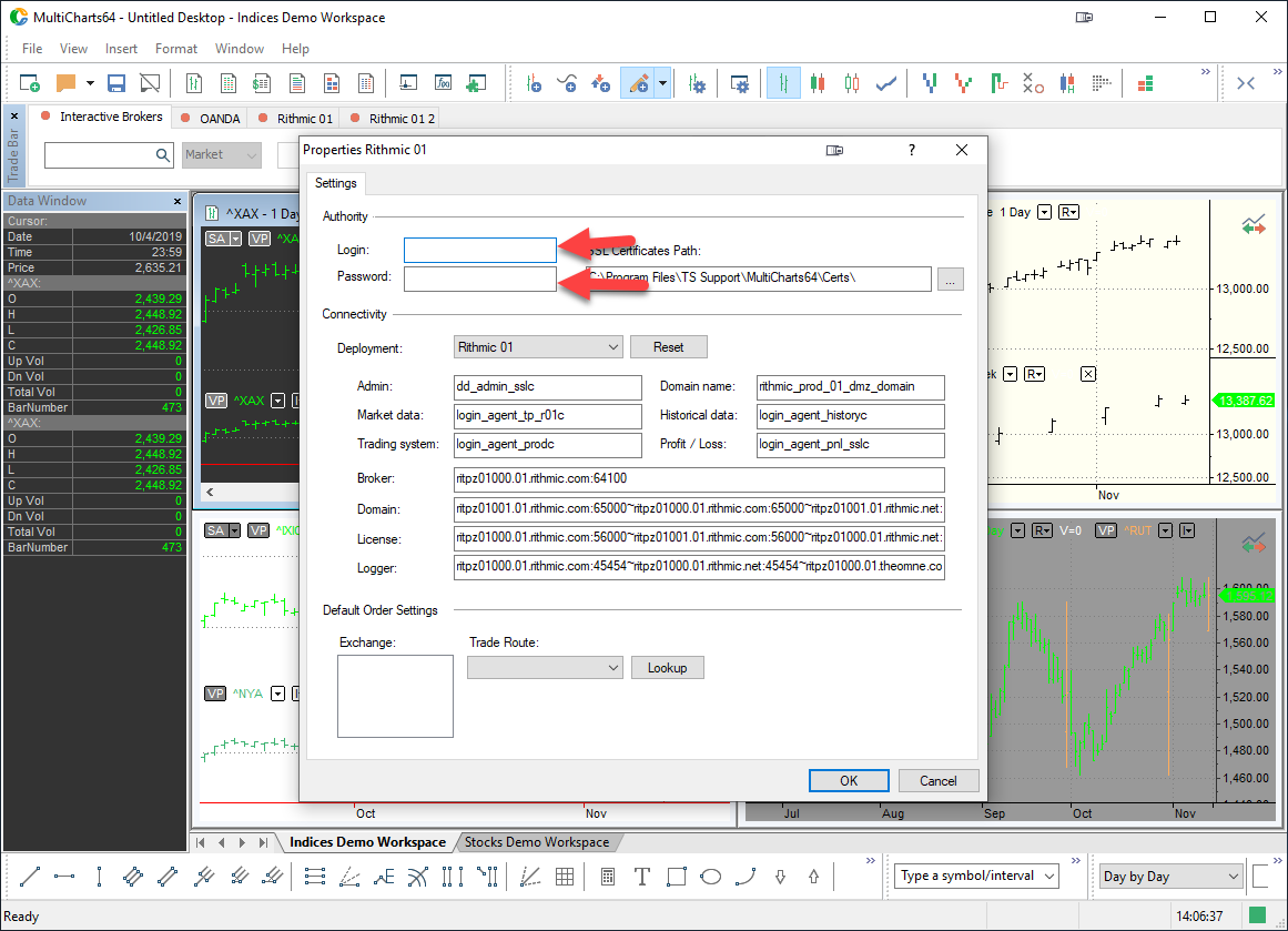 6. Now that the Properties window is open, fill out the datafeed credentials under the Login: and Password: fields.