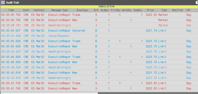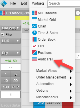 The audit trail widget performs in a similar fashion to the Fills widget, but displays all orders, not just filled ones.