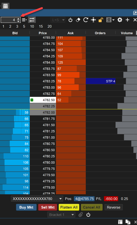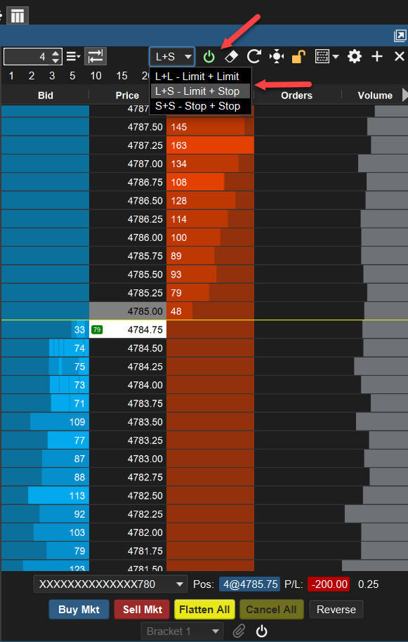 - Place the OCO brackets by scrolling the price levels on the DOM