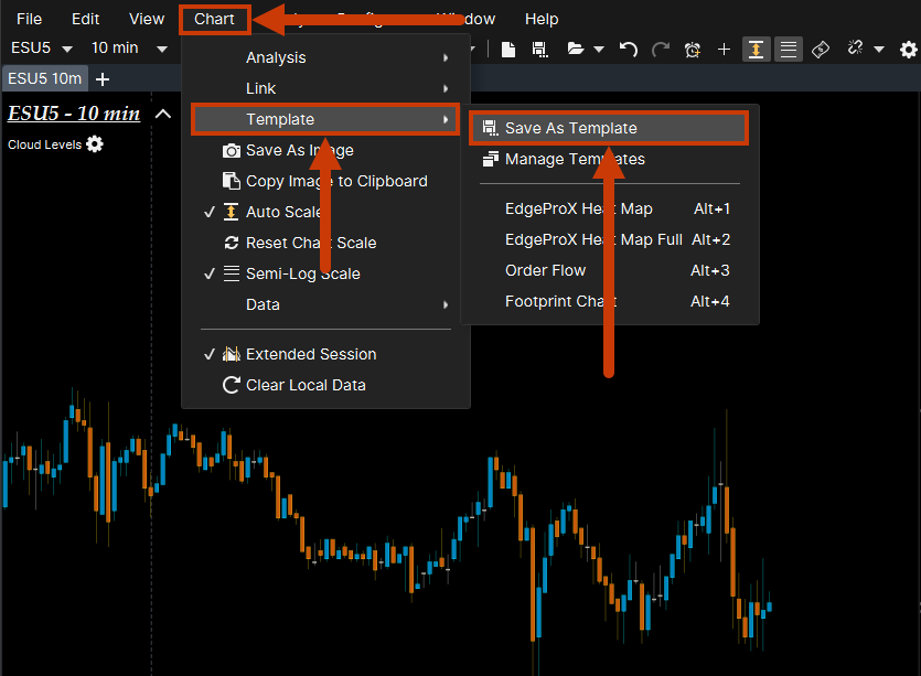 If you wish to apply the chart or analysis to another chart or symbol, first save the chart as a template by selecting Chart > Template > Save As Template.
