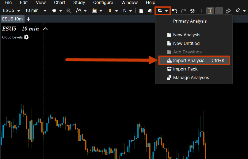 Select the downloaded file and import it into the platform. In the dialog box type @ES or select the instrument using the dropdown button. If you wish to apply the analysis to a different instrument e.g., ESM2 (Rithmic) or EPM22 (CQG), then choose the instrument in the import analysis dialog box. Then click "Import".