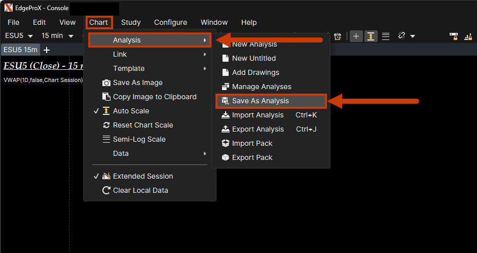 To save your chart analysis, please click Chart > Analysis > Save As Analysis, as shown in the image below:
