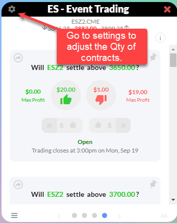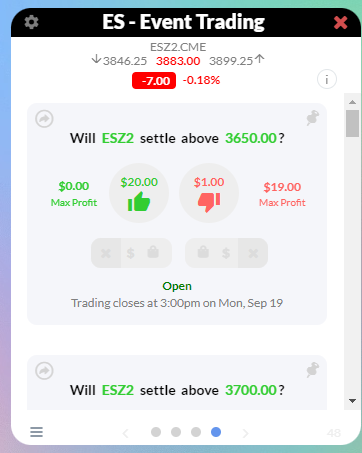 - In the example image above, if you believe the ESZ2 will not settle above 3700.00 (π) it will cost you the full $1 contract value (Max profit $19)*