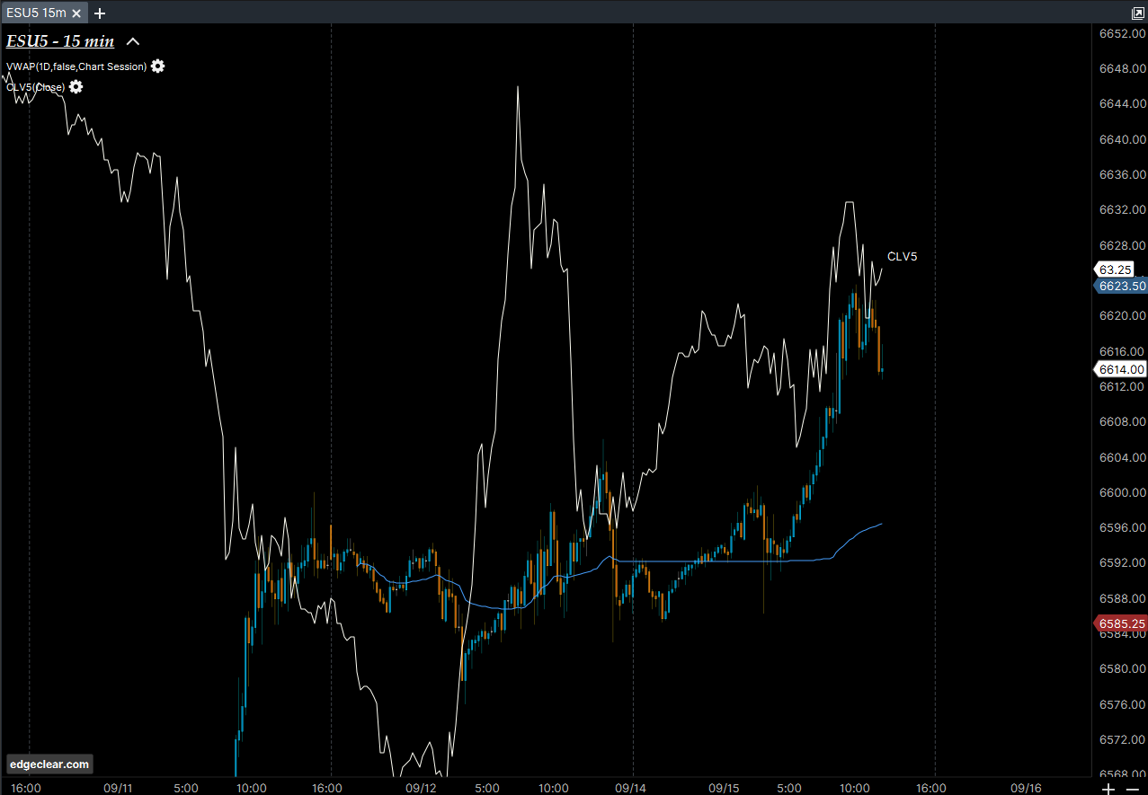 In the screenshot below, the @CL chart is overlaid on top of the @ES chart.