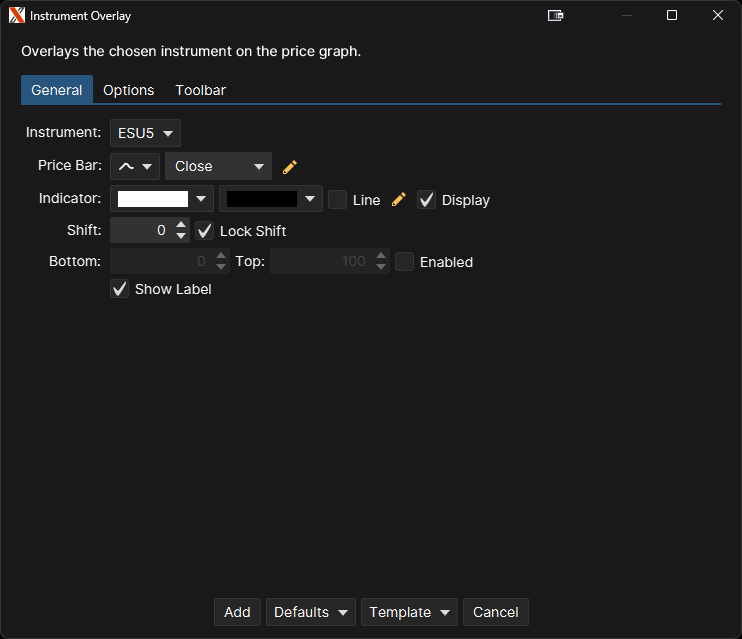 The Instrument Overlay allows users to overlay the chart of any instrument on the active chart. The initial settings for configuring the Instrument Overlay are shown below.