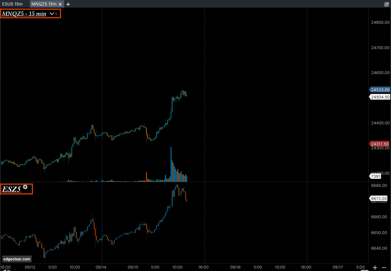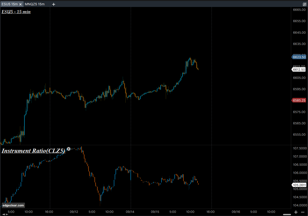 In the screenshot below, MNQZ5 is the active chart while ESZ5 is represented in the Instrument Graph. No custom scale was configured using Top/Bottom, but the Indicator is displayed with a white label.