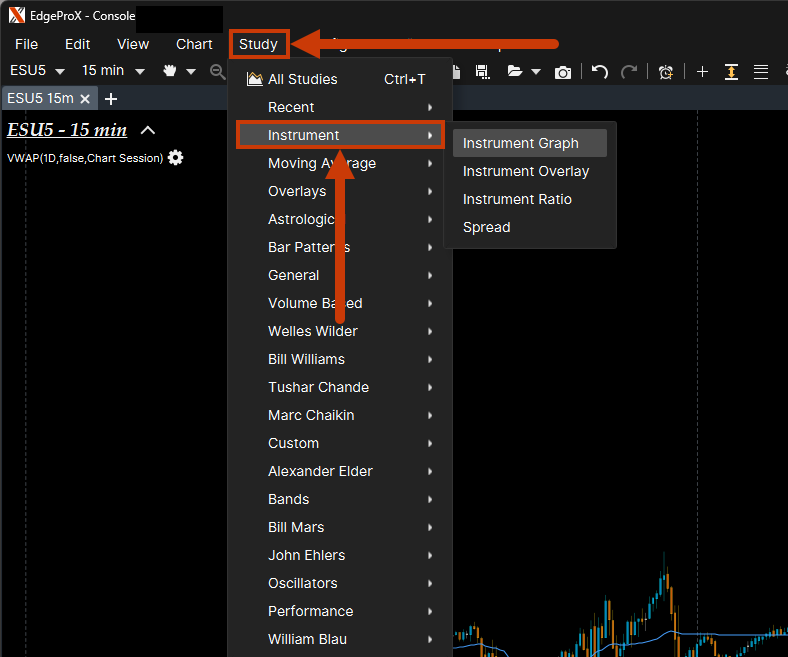 EdgeProX offers a variety of different studies which will allow traders to compare different instruments on one chart.