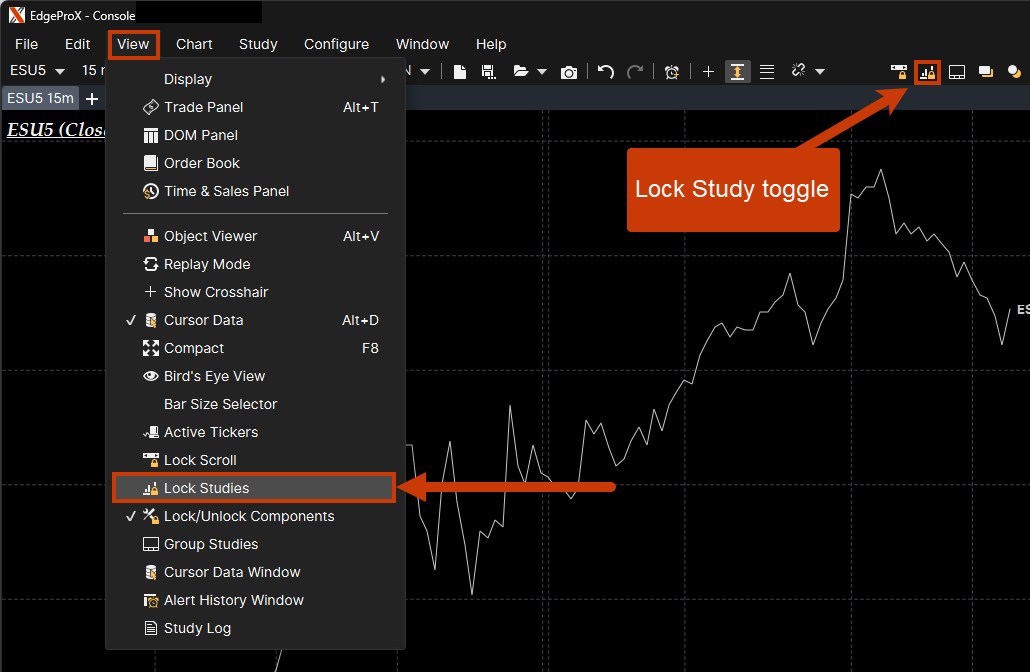 When adding or changing an instrument on a chart, applied studies will not be default carry over to the new instrument. To ensure studies transfer over with the instruments, go to "View" and check "Lock Studies".