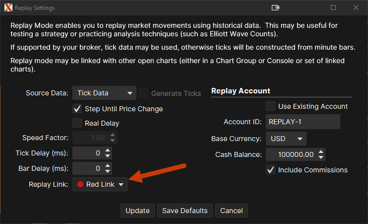 - Replay Link – Use these options to link the replay mode across multiple charts.