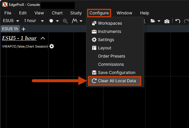 A useful first step is to ensure that the local historical data cache is cleared. Click on 'Configure' tab in the top menu bar. Then click 'Clear All Local Data' as shown in the image.