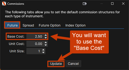 You can set commissions for Futures, Spreads and Future Options. The "Unit Cost" and "Unit Size" is not going to be needed for your account.