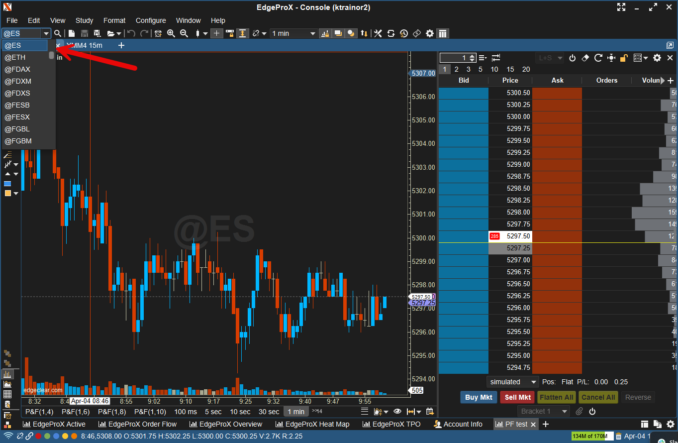 To change the symbol you are looking at, use the dropdown menu in the upper right corner of your EdgeProX window