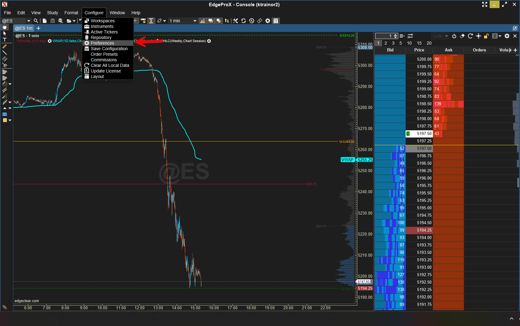 Additionally, it is important to ensure that the "Rithmic Map Delayed Exchange" box is checked in Preferences. You can navigate here by selecting "Configure" at the top of the window, and then Preferences.