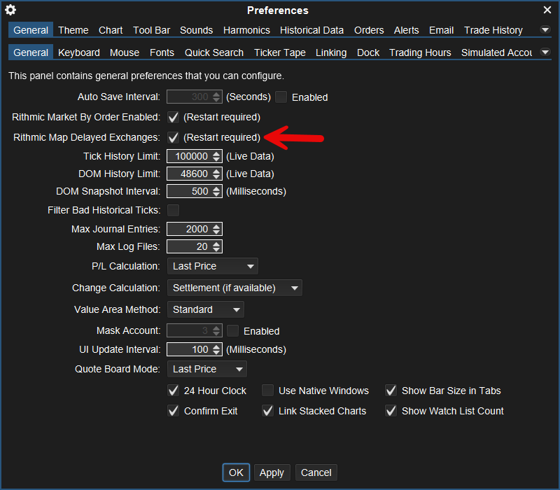 Next, check the "Rithmic Map Delayed Exchanges" box. If this was previously unchecked, you will have to restart EdgeProX for the change to take effect.