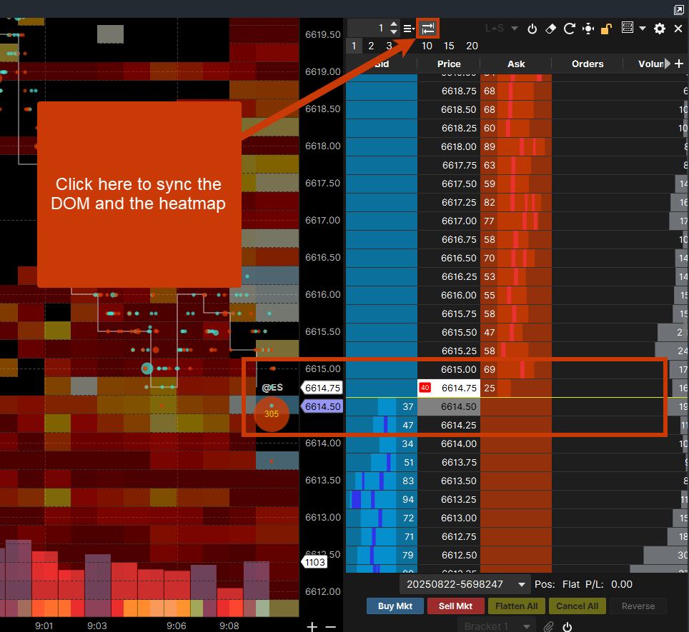 Near the top of the DOM, next to the quantity of orders that can be placed you will see two set of arrows that converge towards each other. Once you click this, the DOM and the heat map will automatically sync together.