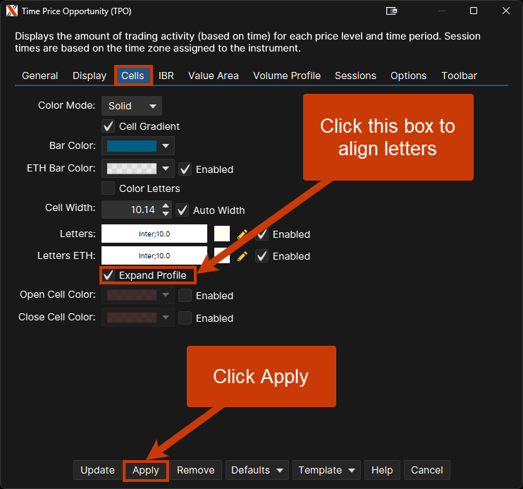 Next, you can change the TPO to replicate a 30 minute bar chart. This will give you a more accurate depiction of how the price actually moved through the day. This can be done by going to the cog wheel again then clicking "All Settings". Then you will want to navigate to the "Cells" tab. You should see a check box labeled "Expand Profile". After clicking this, your TPO charts will change from a histogram to emulate a bar chart. See images below for clarity: