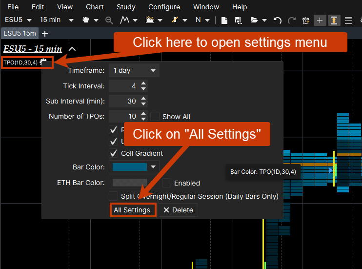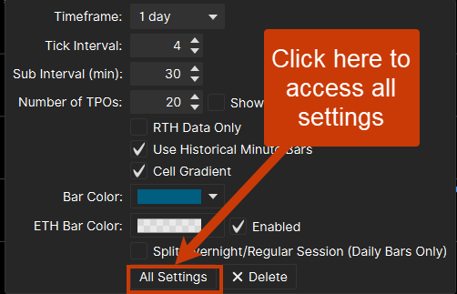 In the EdgeProX TPO charts, you have the ability to view a traditional TPO Chart and the ability to align the letters to make it look like a more traditional bar chart. This can be done by going to the cog wheel again then clicking "All settings". ...