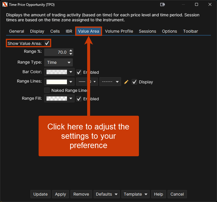 To access and change settings for the value area you will want to navigate to the "Value Area" tab.