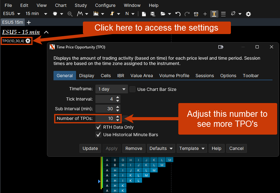 Once the page is pulled up you will see your TPO charts. The default setting is currently set to only show 20 TPO charts. The can be changed by going to the cog wheel next to the TPO indicator. The adjusting the "Number of TPOs"