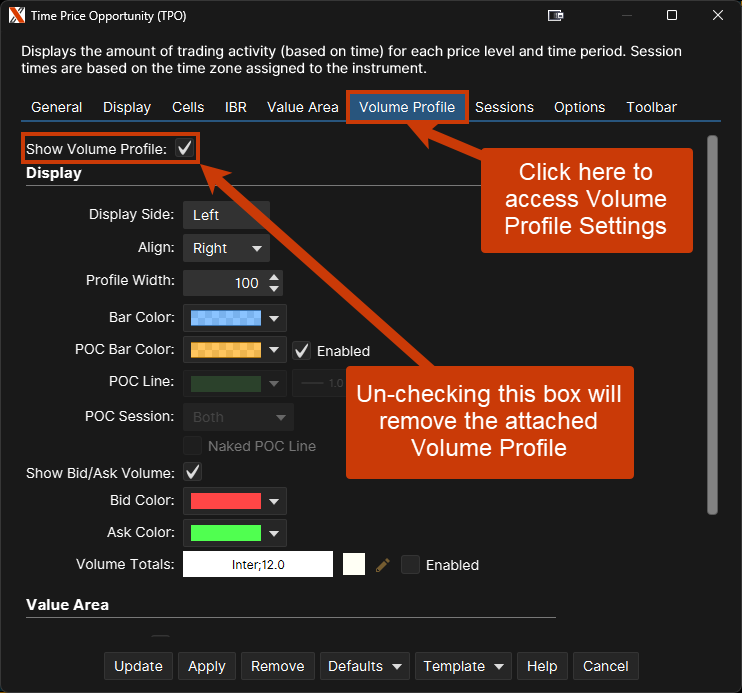 The last setting that is included in the default TPO chart in EdgeProX is the Volume Profile attached to the TPO chart. You can easily turn this off by navigating to the "All Settings" tab and then clicking the "Volume Profile" tab. There is an area at the top that says "Show Volume Profile" if you would like this turned off just uncheck the box. See images below for clarity on how to do this: